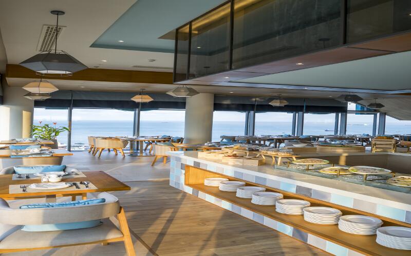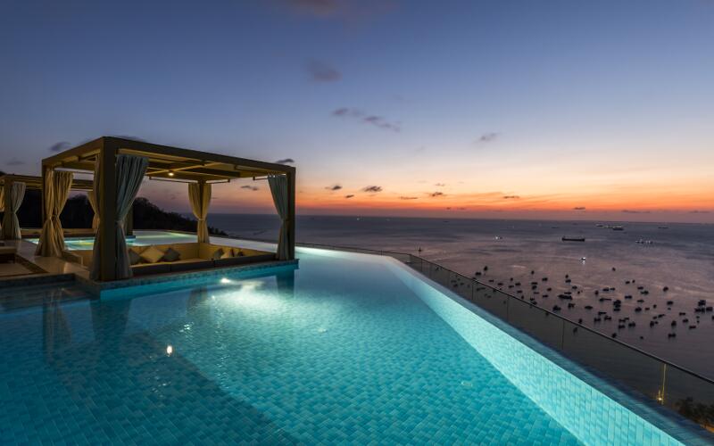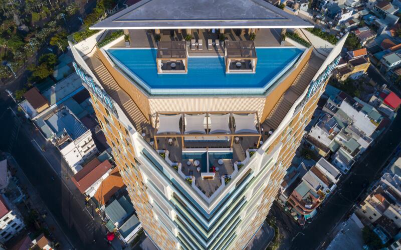 Khách sạn được thiết kế theo phong hiện đại, kiến trúc bên ngoài và nội thất đều lấy ý tưởng từ những sắc màu và phong vị biển, mang đến cho du khách một không gian thân thiện, hiền hòa xanh mát. Khách sạn có 10 hồ bơi (8 hồ bơi trong nhà hướng biển từ tầng 10 đến tầng 18, một hồ bơi tầng thượng, một hồ sục dành để thư giãn), mang đến cảm giác được hòa mình vào biển xanh ngay trong lòng khách sạn. Tất cả tạo nên dấu ấn riêng, mang đến những trải nghiệm tuyệt vời đối với mỗi du khách